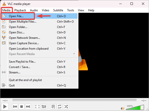 5. انقر على الوسائط في القائمة العلوية واختر فتح ملف.