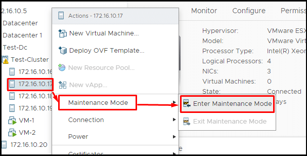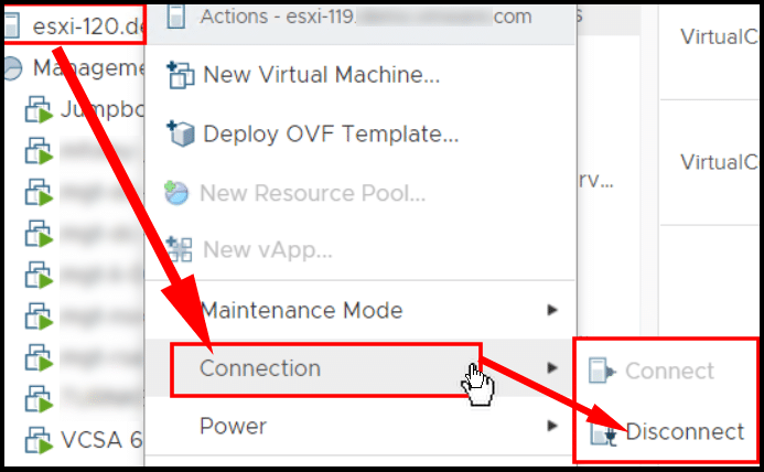 - بمجرد الدخول إلى وضع الصيانة (Maintenance Mode)، انقر بزر الماوس الأيمن مرة أخرى على الخادم. انتقل إلى “Connection” (الاتصال) واختر “Disconnect” (قطع الاتصال) كما هو موضح. (المصدر: VMware)