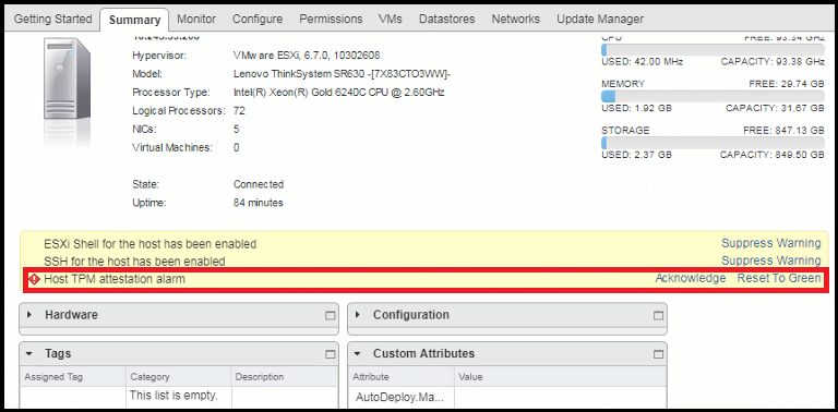 يعتمد ذلك على مدى المشكلة. بشكل عام، يرتبط “إنذار مصادقة TPM للمضيف” (Host TPM Attestation Alarm) بالمضيف أو وحدة TPM المادية. في أسوأ السيناريوهات، قد يتم حجبك عن أجهزتك الافتراضية إذا اعتبر vCenter Server أن مضيفك قد تعرض للاختراق.