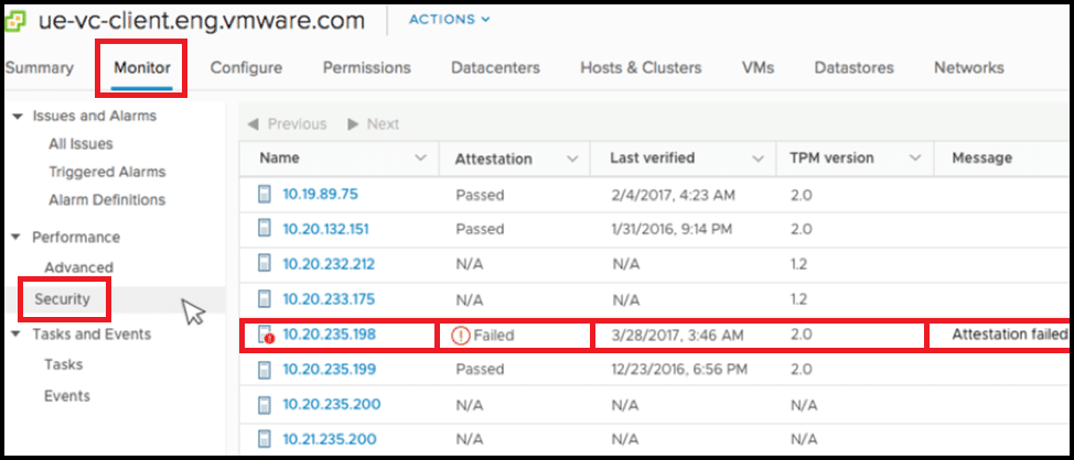 - إذا كانت الرسالة تقول: “تم تعطيل التمهيد الآمن للمضيف“، فاتبع الخطوة 1 أدناه لتمكين Secure Boot من إعدادات UEFI الخاصة بك. إذا كان عمود “Attestation” يشير ببساطة إلى “Failed“، فسيتعين عليك التحقق من ملفات السجل الخاصة بـ vCenter Server. لمزيد من المعلومات حول ملفات السجل، اتبع هذا الدليل.