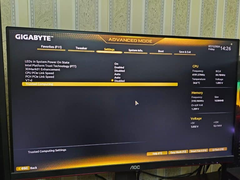 - بعد ذلك، نحتاج إلى تمكين TPM. انتقل إلى علامة التبويب “Settings”. في حالتنا، كان TPM موجودًا ضمن قسم “Trusted Computing”. قد يختلف هذا لنظامك، لذا من الأفضل الرجوع إلى دليل اللوحة الأم الخاص بك.