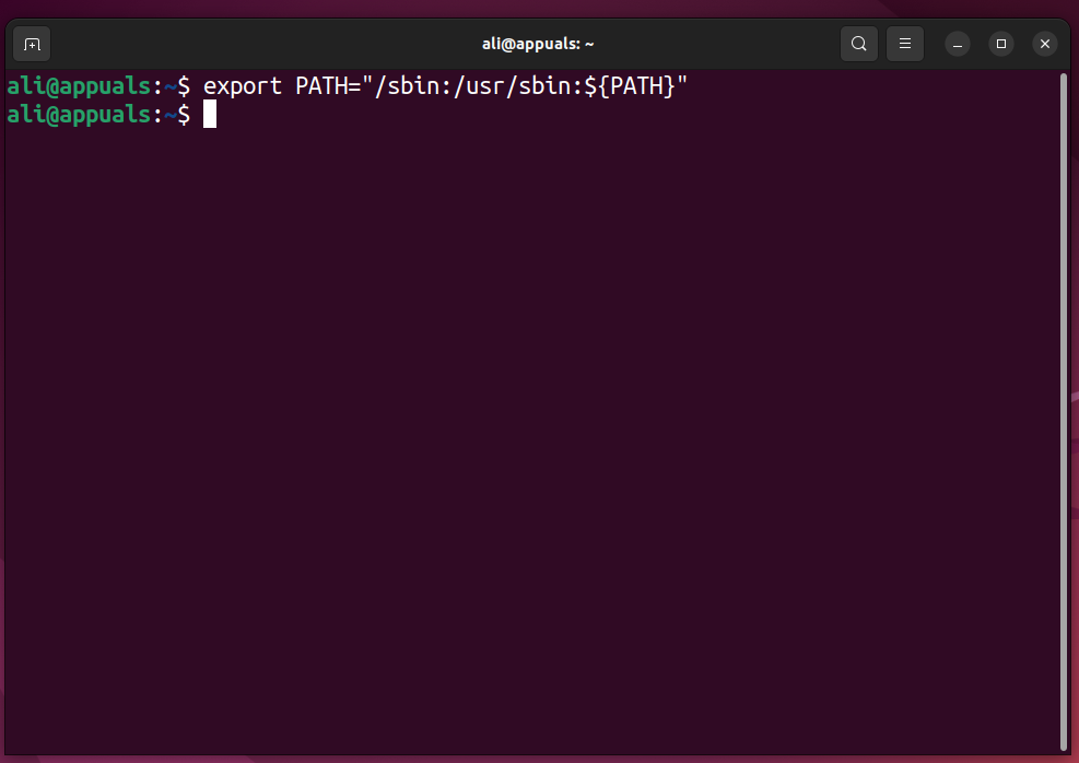 بعد تثبيت حزمة net-tools، إذا كان أمر “ifconfig” لا يزال لا يعمل، فيجب عليك إضافة ‘/sbin’ إلى متغير PATH الخاص بالنظام. هذا ضروري لأن دليل ‘/sbin’ غير متضمن افتراضيًا. يمكنك تنفيذ الأمر التالي لإضافة الدليل إلى متغير PATH الخاص بالنظام.