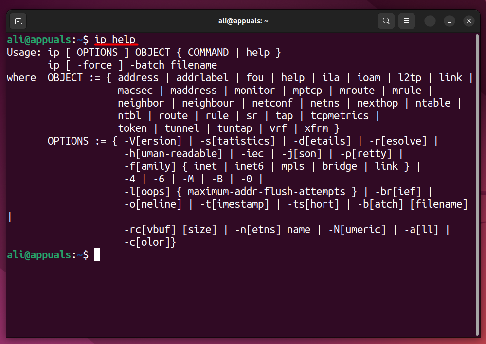 للحصول على مساعدة حول “أمر ip” في Linux، ارجع إلى صفحة الدليل هذه أو استخدم أمر المساعدة التالي.