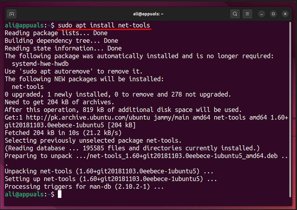 لاستخدام الأمر “ifconfig”، يجب على المستخدمين تثبيت مجموعة أدوات net-tools، كما هو موضح أدناه.