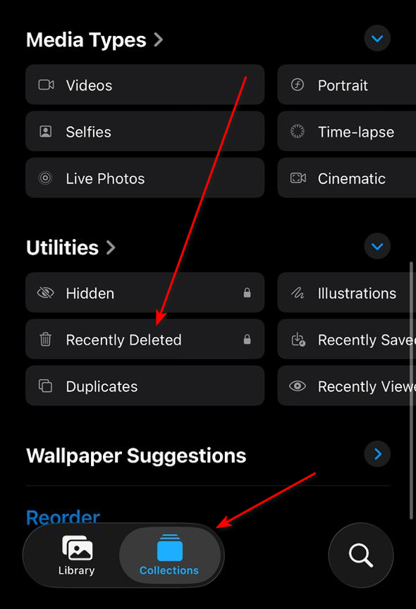 - افتح الصور > انتقل إلى المحذوفة مؤخرًا (غالبًا ما تكون ضمن الأدوات أو الألبومات).