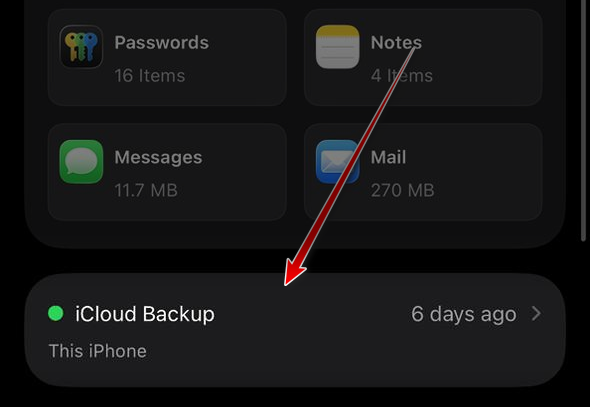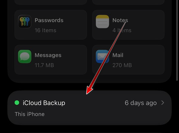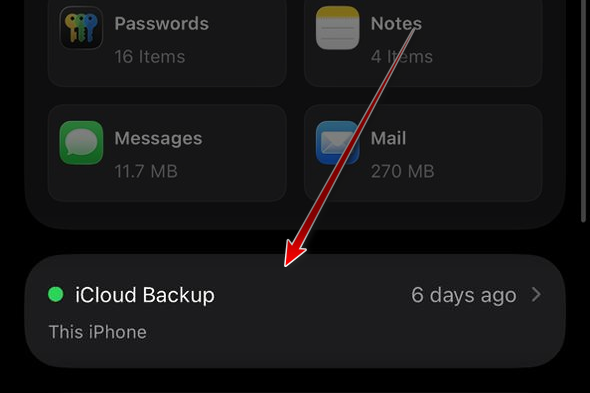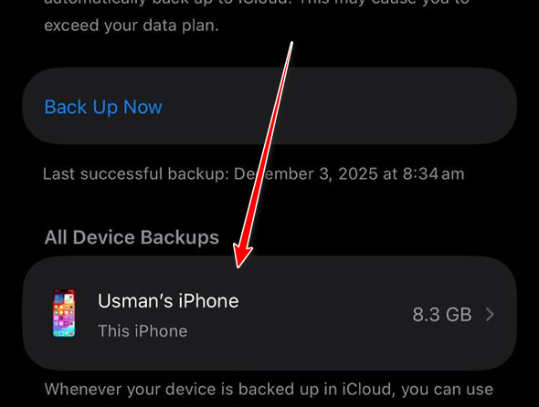 - إذا كنت لا تراها: iCloud > إدارة مساحة تخزين الحساب (أو إدارة التخزين) > النُسخ الاحتياطية > حدد iPhone الخاص بك.