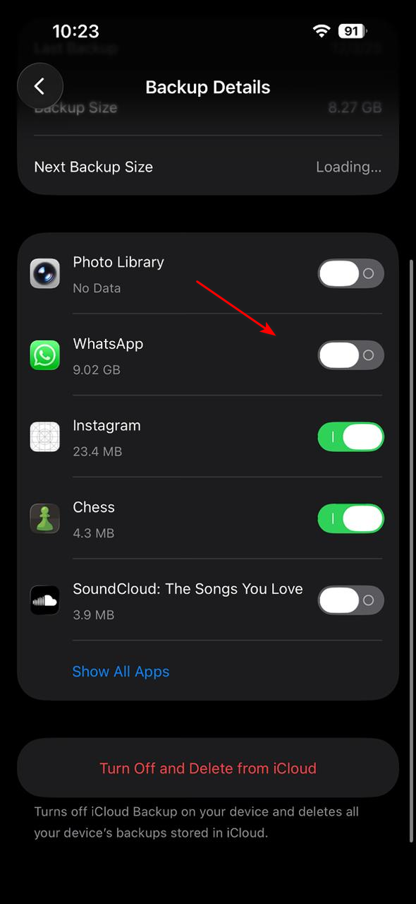 استخدم هذا عندما يكون Next Backup Size كبيرًا جدًا. يمكن أن يؤدي تعطيل النسخ الاحتياطي للتطبيقات الثقيلة إلى تقليل الحجم بسرعة (خاصةً التطبيقات التي تخزن ملفات كبيرة في وضع عدم الاتصال).