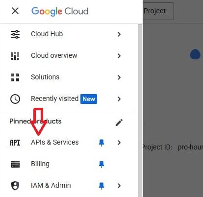 من خيارات القائمة، انقر على API & Services للوصول إلى واجهات برمجة التطبيقات (APIs) المُمكّنة لمشروعك.
