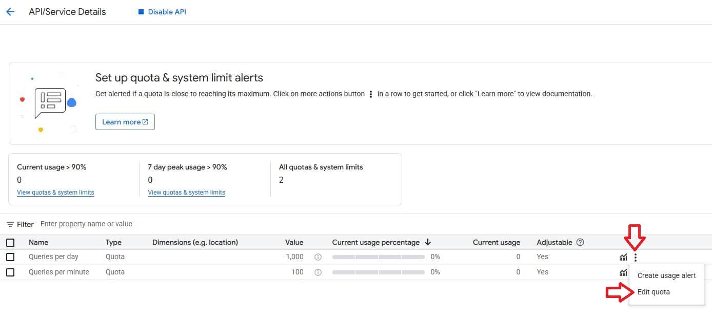 داخل تفاصيل API، انقر على الحصص وحدود النظام لعرض استخدامك الحالي وحدودك.