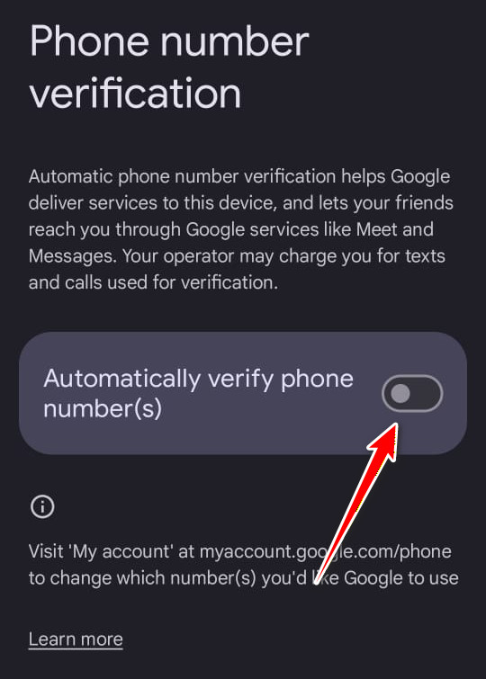 إذا كان الرمز المميز للتحقق القديم المخزن على خادم Google لا يتطابق مع إعدادات SIM أو الشبكة الحالية لديك، فستستمر العملية في الفشل. يؤدي تبديل خيار التحقق من رقم الهاتف إلى إلغاء الرمز المميز القديم وإجبار النظام على إصدار رمز جديد.