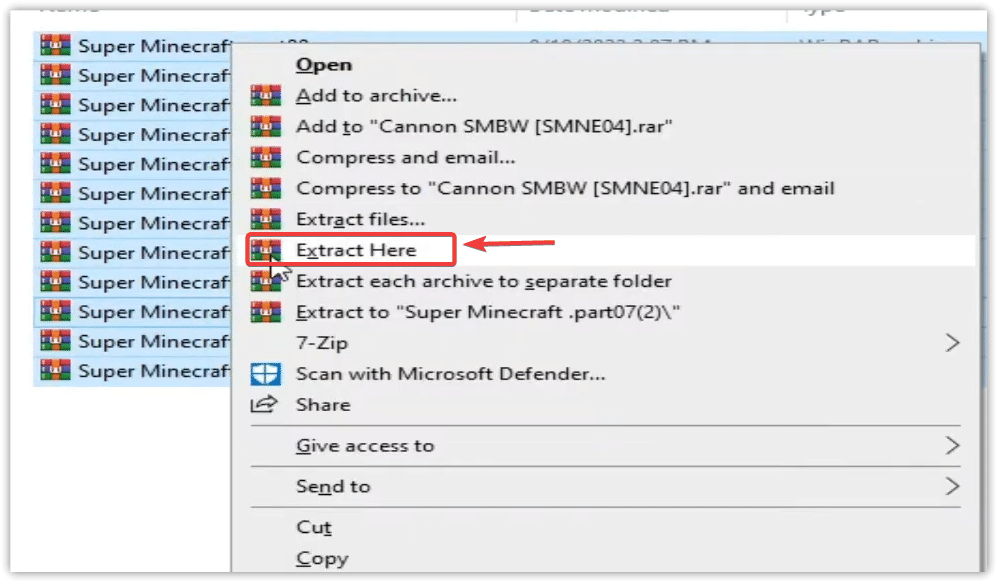 - انقر بزر الماوس الأيمن على الملف الأول في السلسلة (عادةً part1.rar أو ملف .rar الرئيسي) وحدد استخراج هنا.