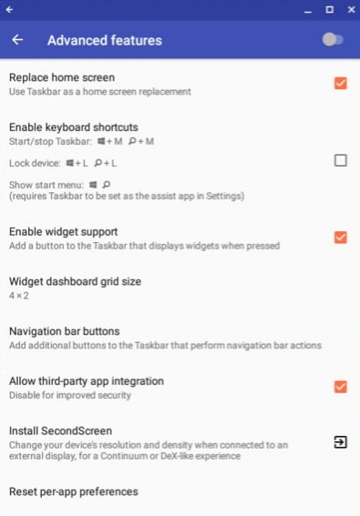 قم بتنزيل وتثبيت تطبيق Taskbar من Play Store على جهاز Chromebook الخاص بك. افتح التطبيق، وانتقل إلى Advanced Features ضمن Settings. هنا، تأكد من تحديد المربعين “Replace home screen” و “Enable Widget Support”.