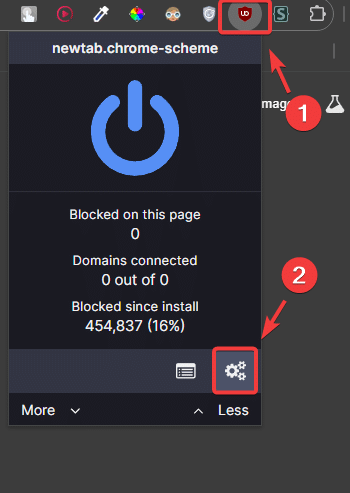 - افتح uBlock Origin وانقر على أيقونة الإعدادات لفتح لوحة التحكم.