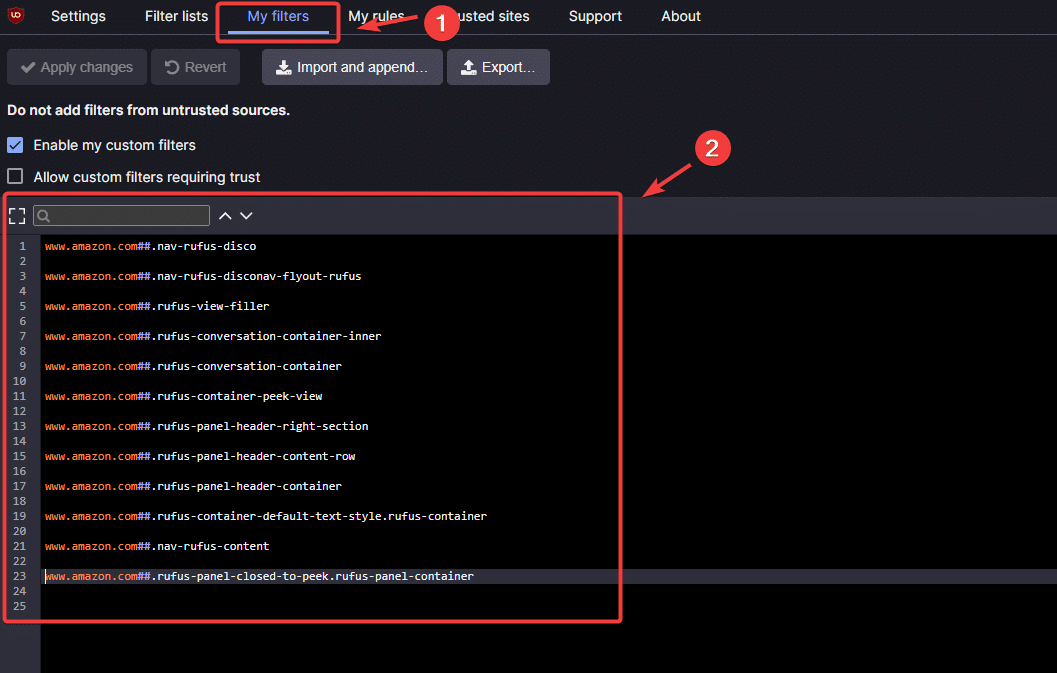- انتقل إلى فلاتري في الأعلى وأدخل الأسطر التالية لحظر Rufus بالكامل: