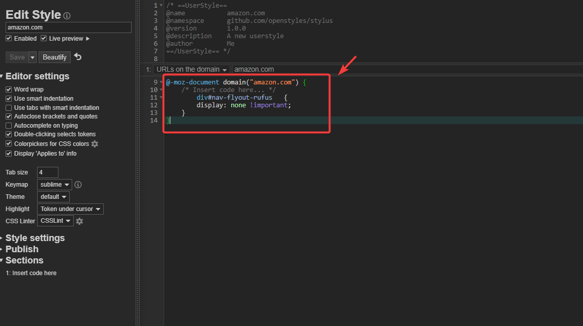 - ثم، انقر على amazon.com لفتح الصفحة حيث يمكنك إضافة كود CSS مخصص.