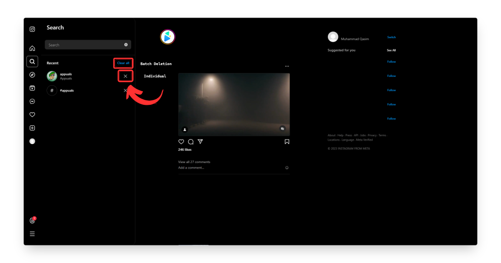 إذا كنت تستخدم Instagram الويب، فلا يزال بإمكانك مسح سجل البحث الخاص بك باستخدام طرق مشابهة جدًا لتلك المذكورة أعلاه. إليك كيفية القيام بذلك: