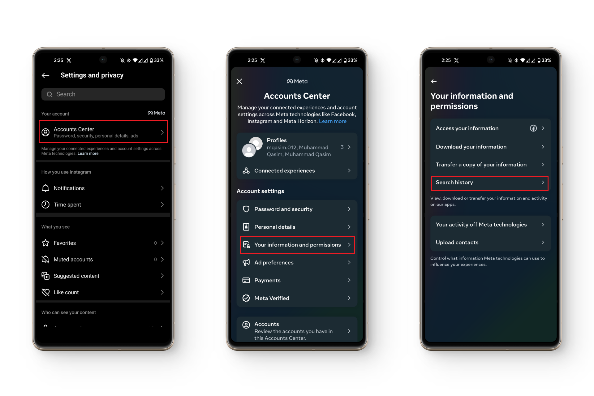 ملاحظة: ضع في اعتبارك أن إلغاء تثبيت تطبيق Instagram أو مسح ذاكرة التخزين المؤقت له لن يؤدي بالضرورة إلى حذف أي من عمليات البحث في حسابك. فهي لا تُخزّن في ذاكرة التخزين المؤقت، بل توجد على خوادم Instagram ومرتبطة بحسابك.
