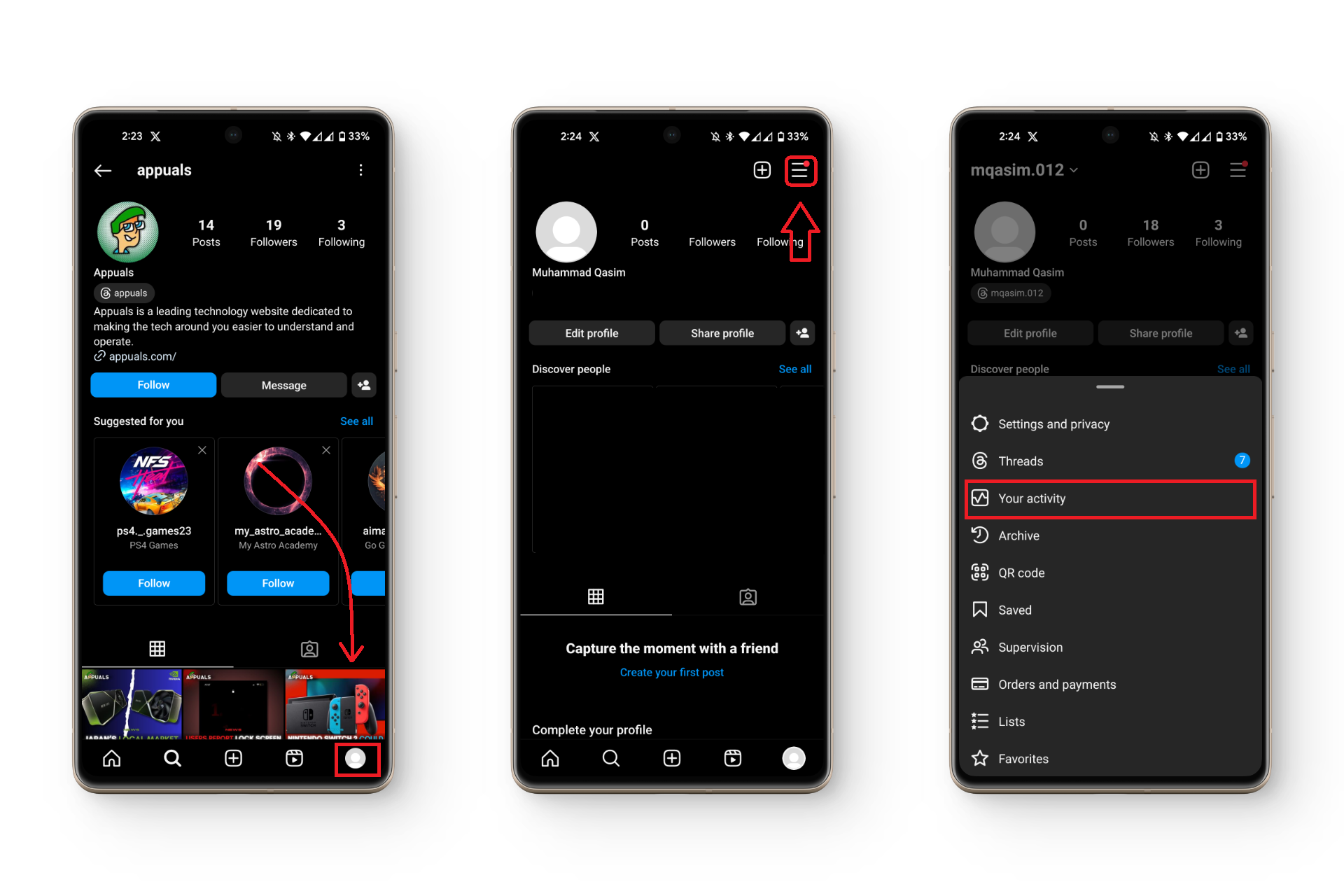 - اضغط على “نشاطك“، وابحث عن “عمليات البحث الأخيرة” ضمن “كيف تستخدم Instagram”.