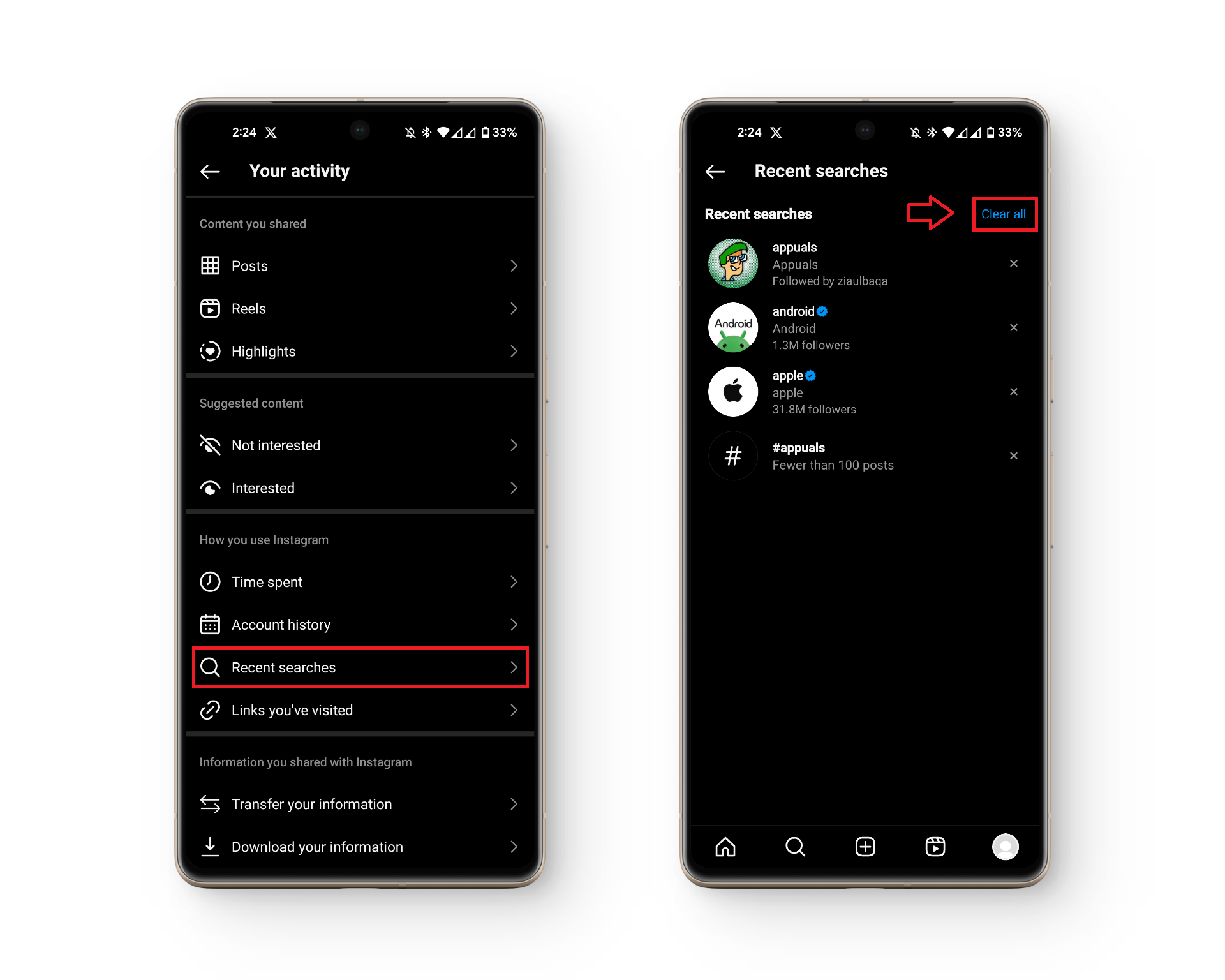Instagram يوفر لك أيضًا طريقة لمسح سجل البحث بالكامل بنقرة واحدة باستخدام إعداد “نشاطك“. ومع ذلك، تأكد من عدم حذف أي شيء قد تحتاج إلى الرجوع إليه لاحقًا. حلّل عمليات البحث الخاصة بك قبل اتباع الخطوات أدناه.