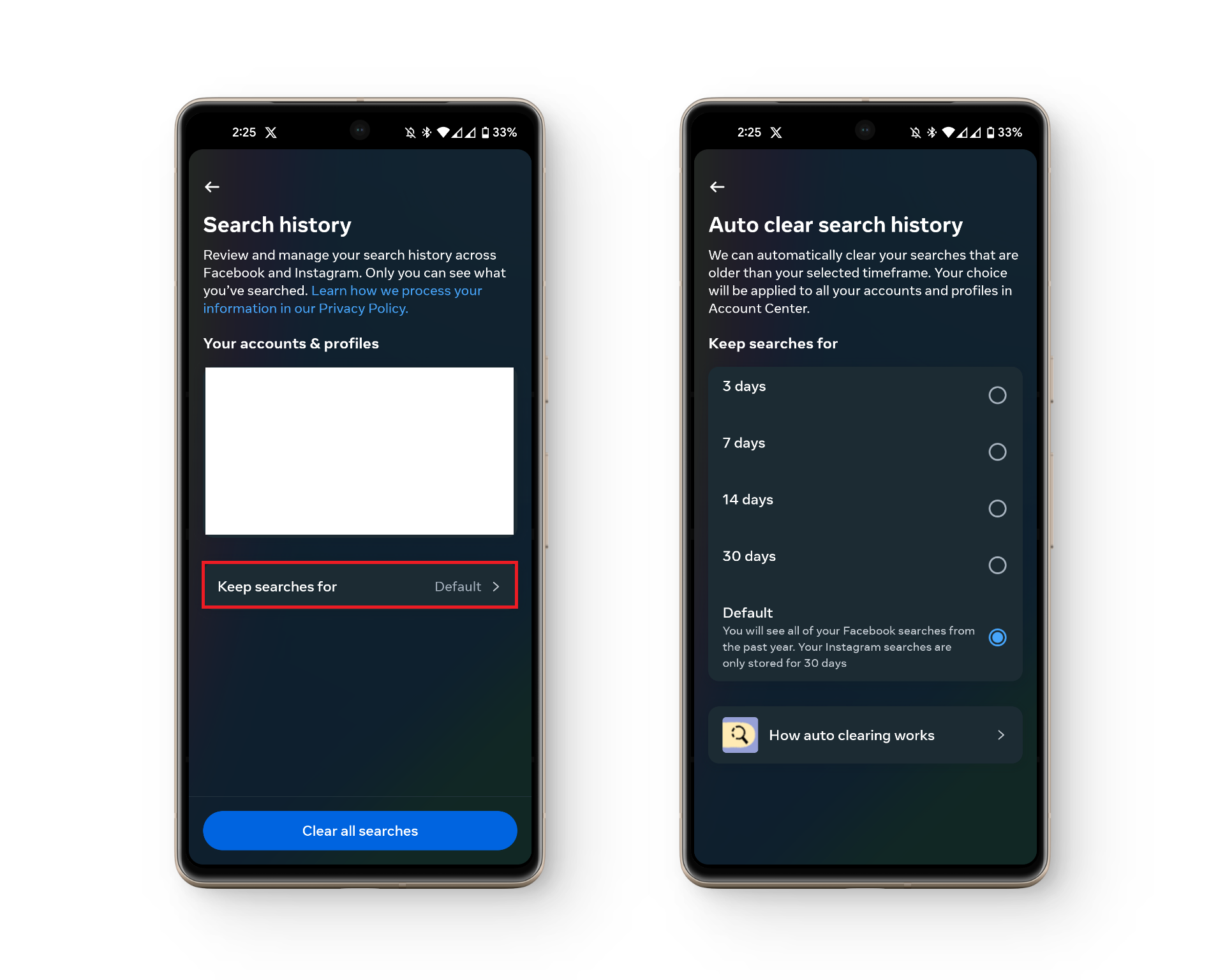 إذا كنت لا ترغب في عناء حذف كل نتيجة بحث يدويًا، أو تكرار العملية كل بضعة أيام، يتيح لك Instagram حذف سجل البحث الخاص بك تلقائيًا بعد فترة زمنية محددة.