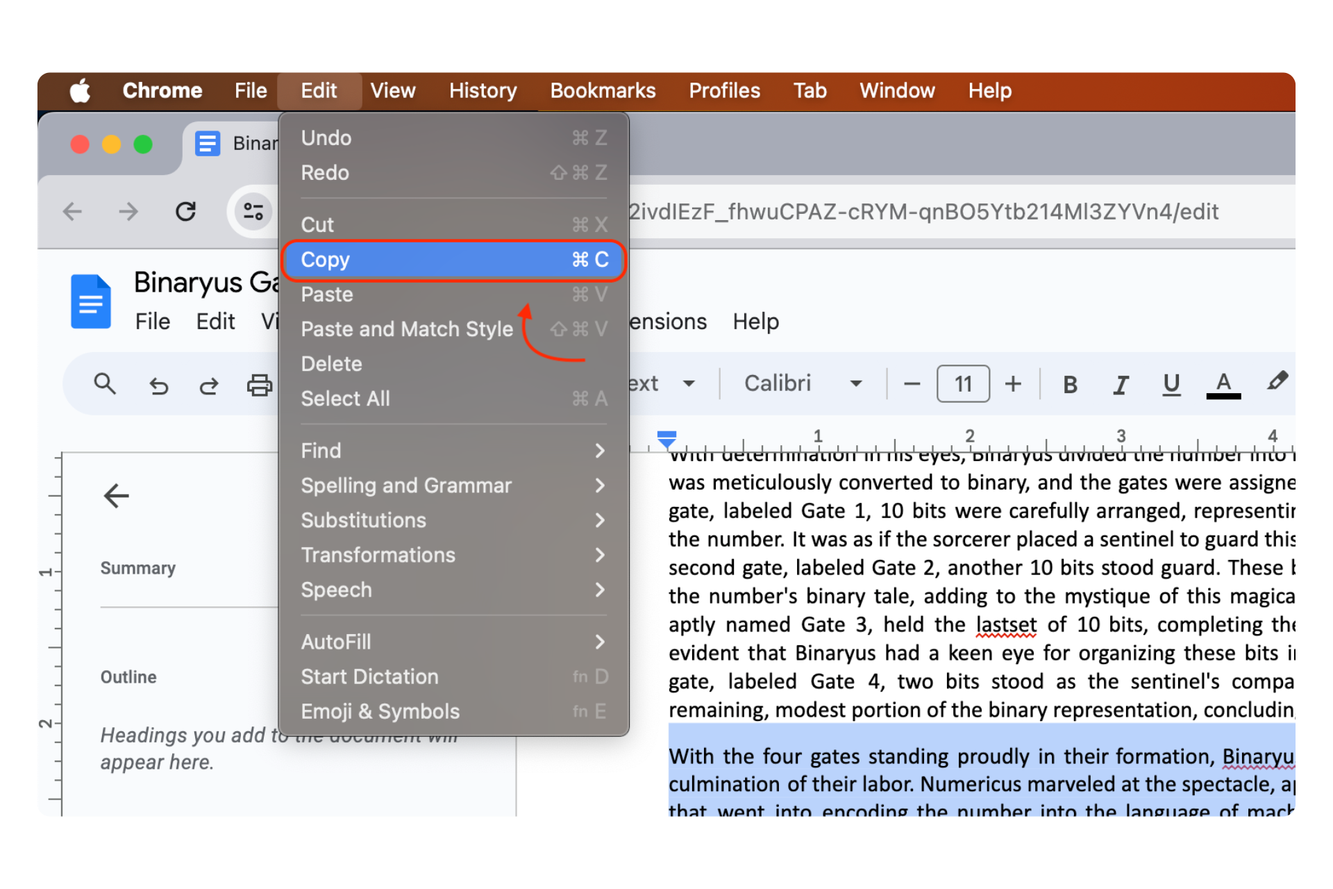 يمكنك أيضًا استخدام شريط القوائم في الأعلى لنسخ النص. بعد تمييز الجزء الذي تريد نسخه، ما عليك سوى الانتقال إلى “تعديل” ثم تحديد “نسخ“.