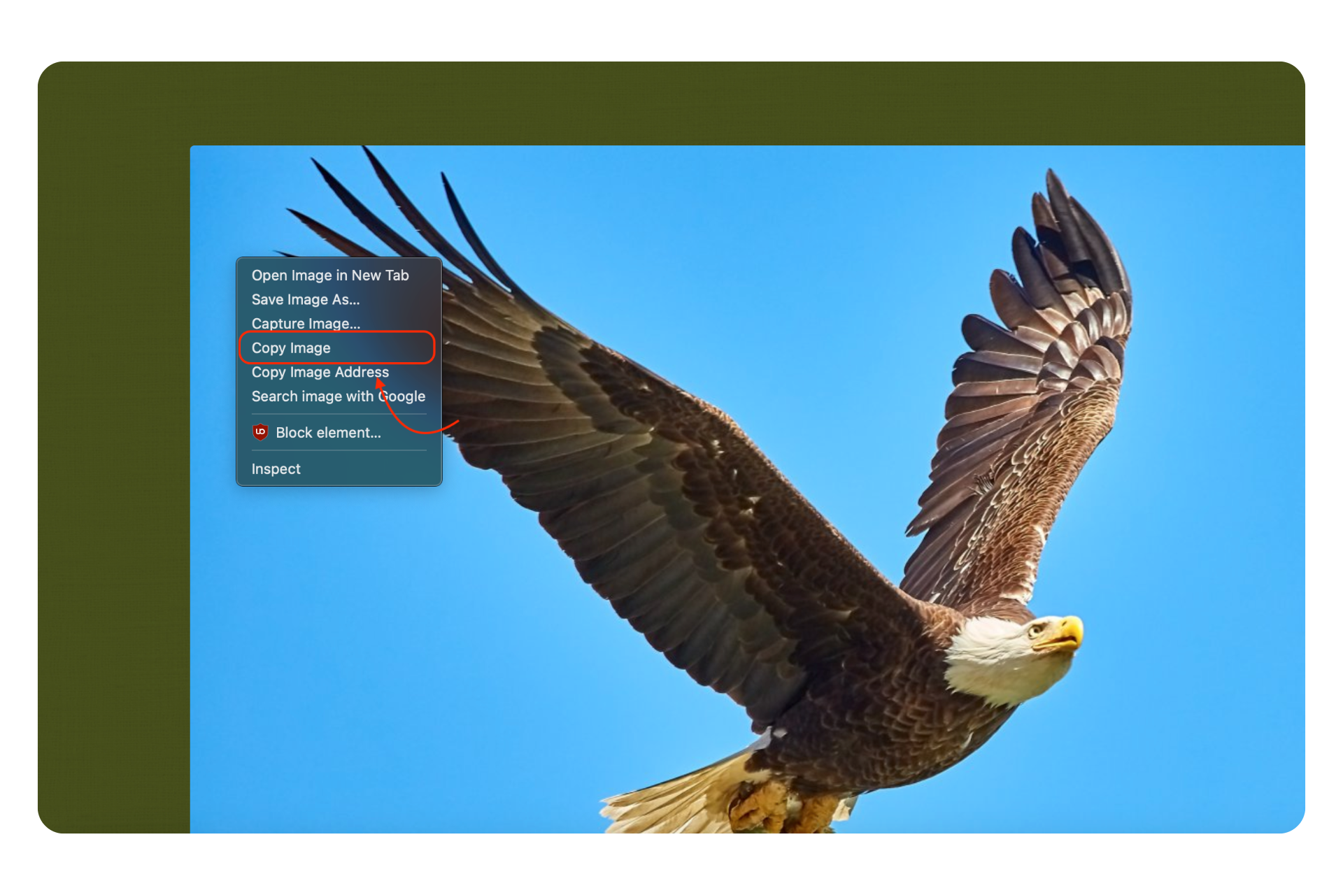 - حدد الصورة واستخدم Command + C للنسخ. للصق، ضع المؤشر واضغط Command + V أو استخدم قائمة الاختصارات.