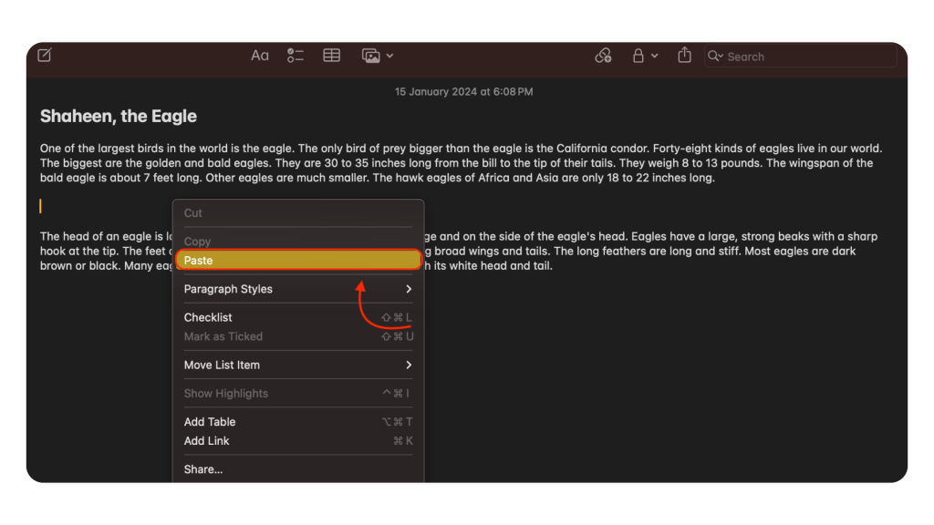 الآن بعد أن تم نسخ النص، انتقل إلى مستند قابل للتحرير وضع المؤشر في الموضع الذي تريد لصق النص فيه. الآن اضغط على Command + V للصق النص.
