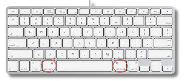 مفتاح Command لا يقع في نفس مكان Ctrl على لوحة مفاتيح Windows. بدلاً من ذلك، ستجده على جانبي مفتاح Spacebar، أقرب إلى منتصف لوحة المفاتيح، مع رمز يشبه النجمة رباعية الرؤوس أو ورقة البرسيم.
