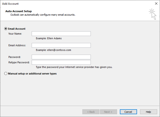 - اختر إنشاء ملف تعريف تلقائيًا عن طريق تحديد خيار حساب البريد الإلكتروني، أو اختر الإعداد اليدوي لإنشاء ملفات تعريف IMAP أو POP مع إعدادات إضافية يدويًا.