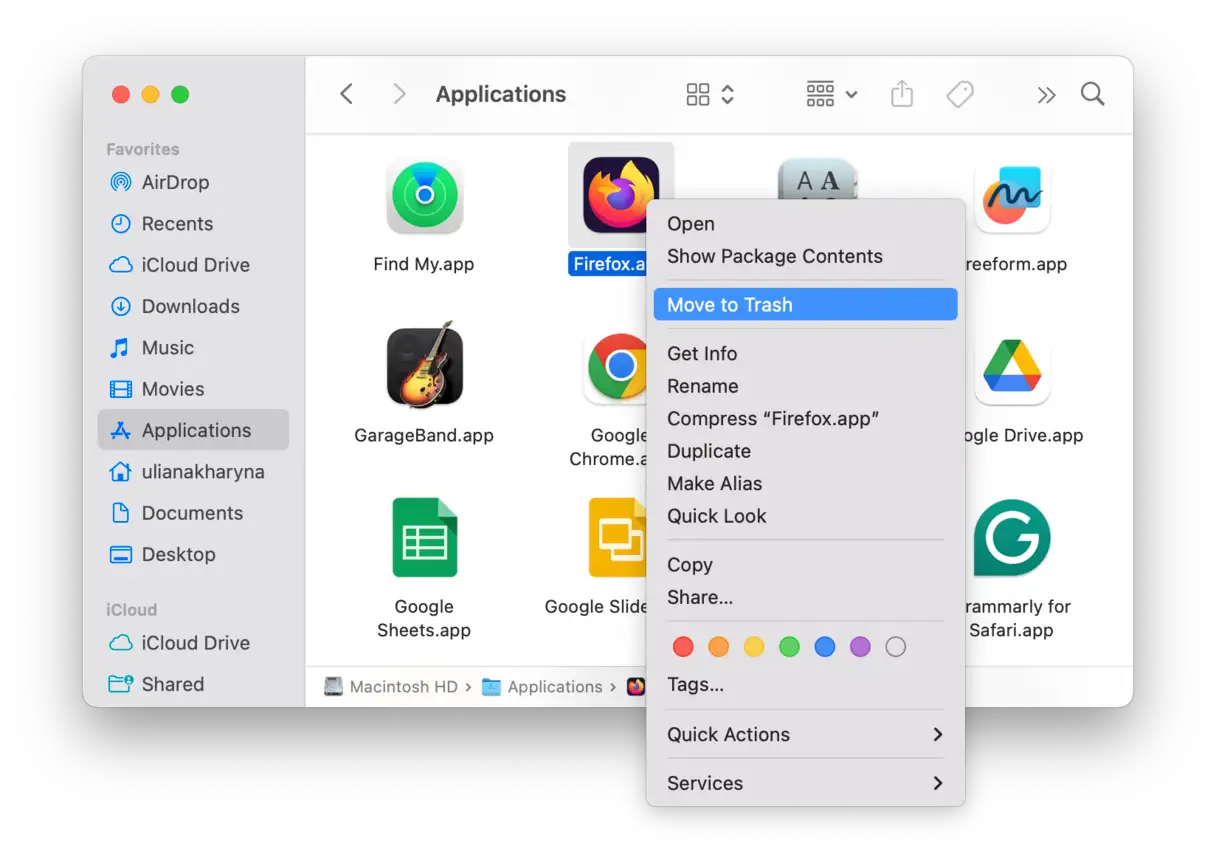 تتألف عملية إلغاء تثبيت Firefox يدويًا من خطوتين.أولًا، عليك حذف ملف التطبيق نفسه.ثم عليك التخلص من جميع الملفات التي وضعها على جهاز Mac.
