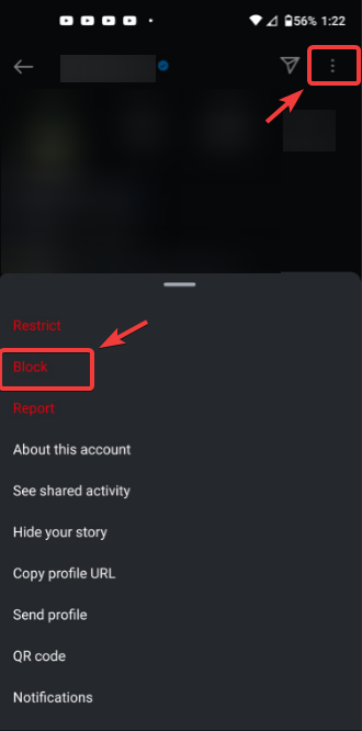 - بعد ذلك، اضغط على النقاط الثلاث في الزاوية العلوية اليمنى واختر حظر.