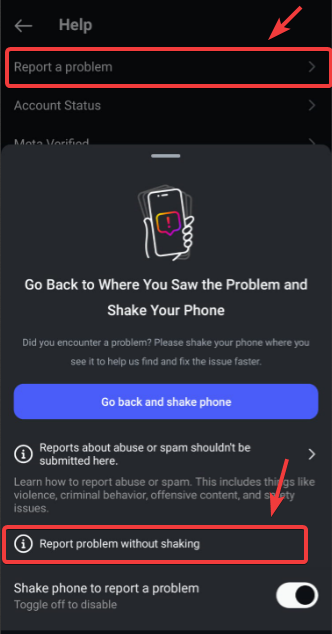 - ثم، اضغط على الإبلاغ عن مشكلة واختر الإبلاغ عن مشكلة بدون هز.
