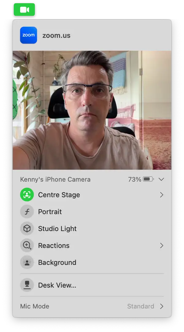 - بعد إيقاف تشغيل “في مركز الشاشة” (Center Stage)، انقر على أيقونة الكاميرا في شريط الأدوات لمعاينة العرض.
