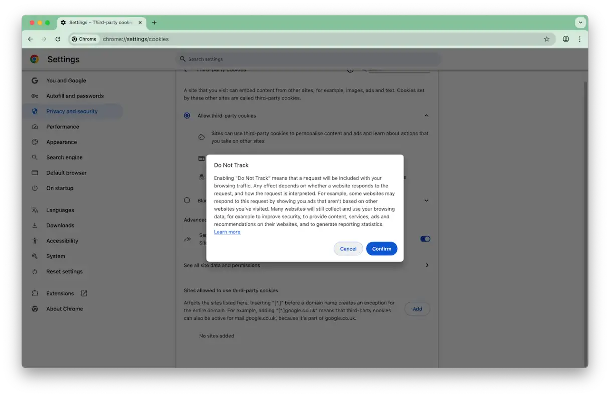 على الرغم من أن متصفح Google Chrome لا يركز على الخصوصية بنفس القدر الذي يركز عليه Safari، إلا أنه لا يزال بإمكانك حظر التتبع عبر المواقع إلى حد ما. ومع ذلك، يختلف نهج Google عن نهج Apple: ففي حين أن Safari يحذف بيانات التتبع عندما تختار حظر التتبع عبر المواقع، فإن Chrome يرسل ببساطة طلبًا إلى مواقع الويب لعدم تتبعك. ويعود الأمر إليهم في الامتثال لهذا الطلب. بمعنى آخر، يعتمد Chrome على “حسن نية” مواقع الويب في احترام طلب عدم التتبع، بينما يفرض Safari حظرًا فعليًا.