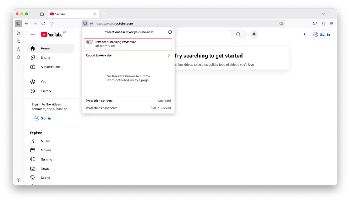 - انتقل إلى الموقع المطلوب، ثم انقر على رمز الدرع الموجود على يسار شريط العنوان، وقم بتعطيل “الحماية المعززة للتتبع” (Enhanced Tracking Protection).