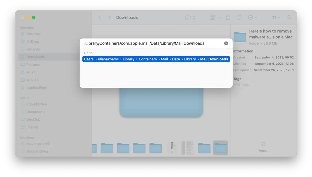 ~/Library/Containers/com.apple.mail/Data/Library/Mail Downloads ثم اضغط على مفتاح الإدخال “Return”.
