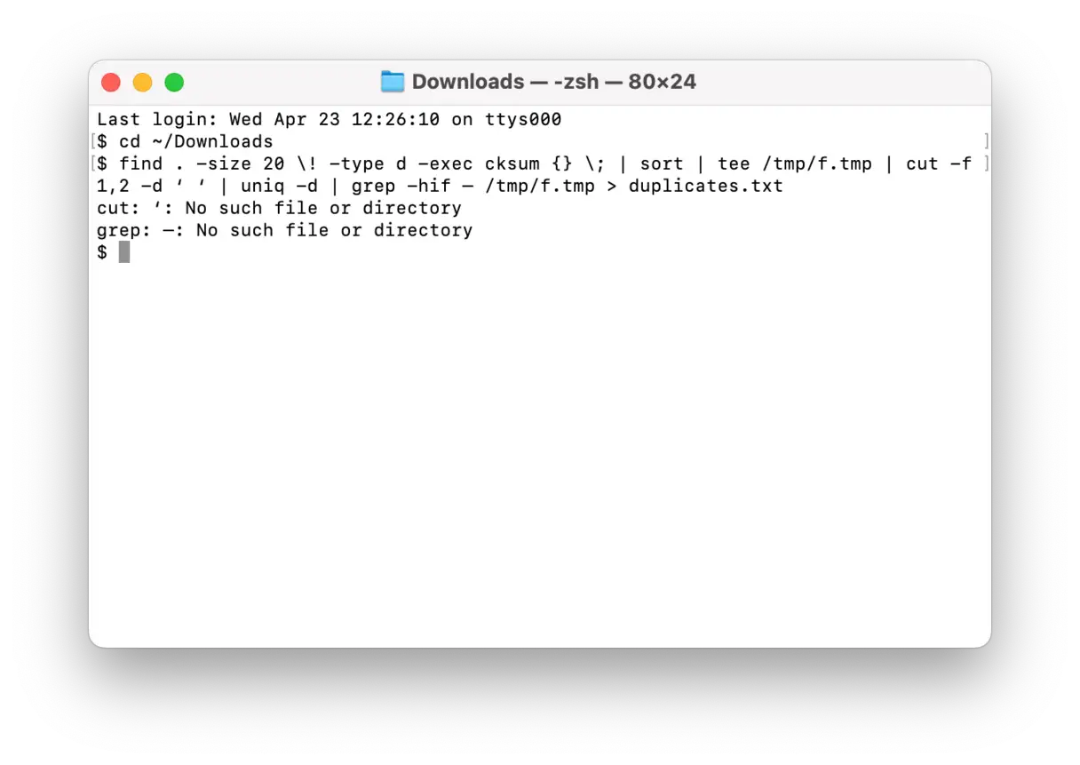 find . -size 20 ! -type d -exec cksum {} ; | sort | tee /tmp/f.tmp | cut -f 1,2 -d ‘ ‘ | uniq -d | grep -hif – /tmp/f.tmp > duplicates.txt ثم اضغط على Return.