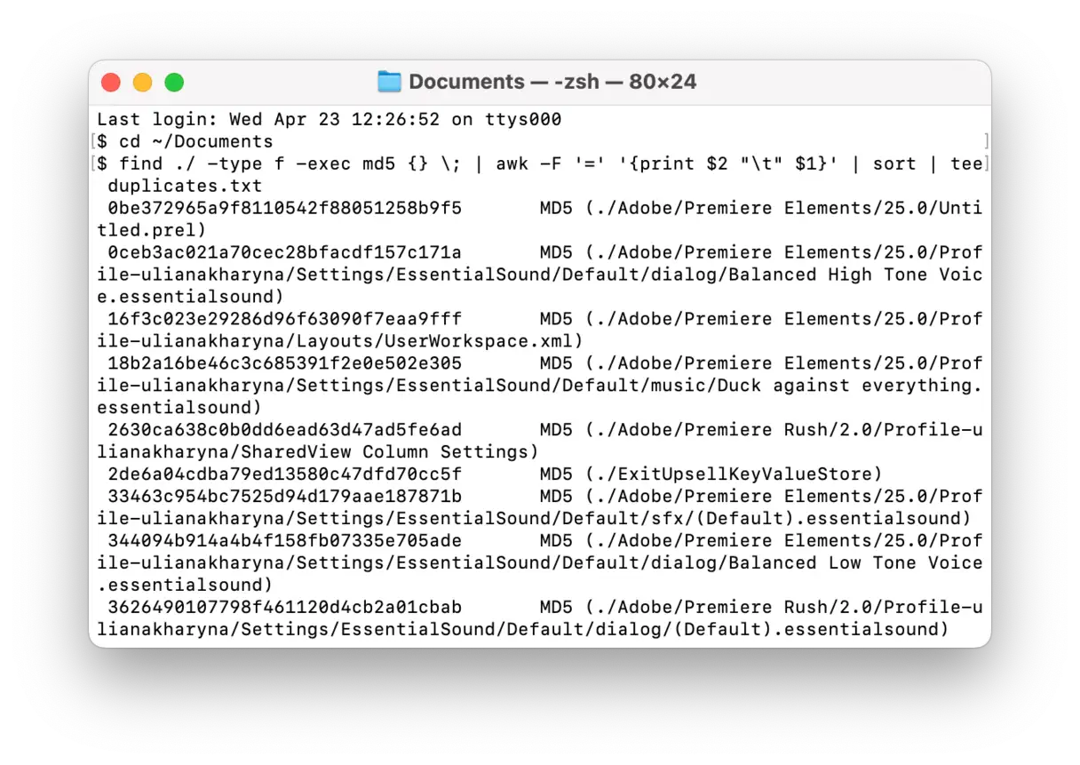 find ./ -type f -exec md5 {} ; | awk -F '=' '{print $2 "t" $1}' | sort | tee duplicates.txtثم اضغط على Return.