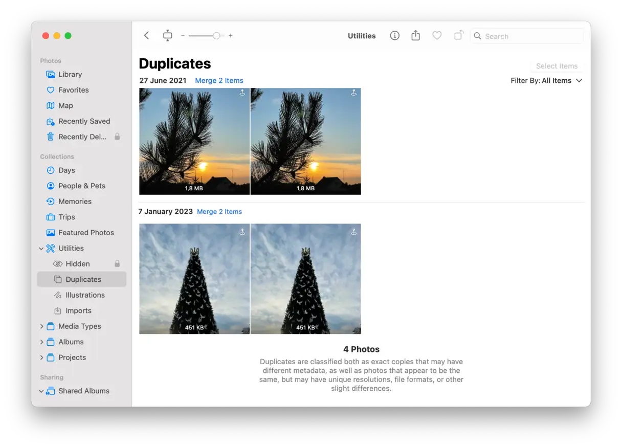 - انقر على “Merge [x] Items” ثم “Merge [x] Exact copies”. سيؤدي هذا إلى دمج النسخ المتطابقة تمامًا في نسخة واحدة، مما يوفر مساحة تخزين قيمة.