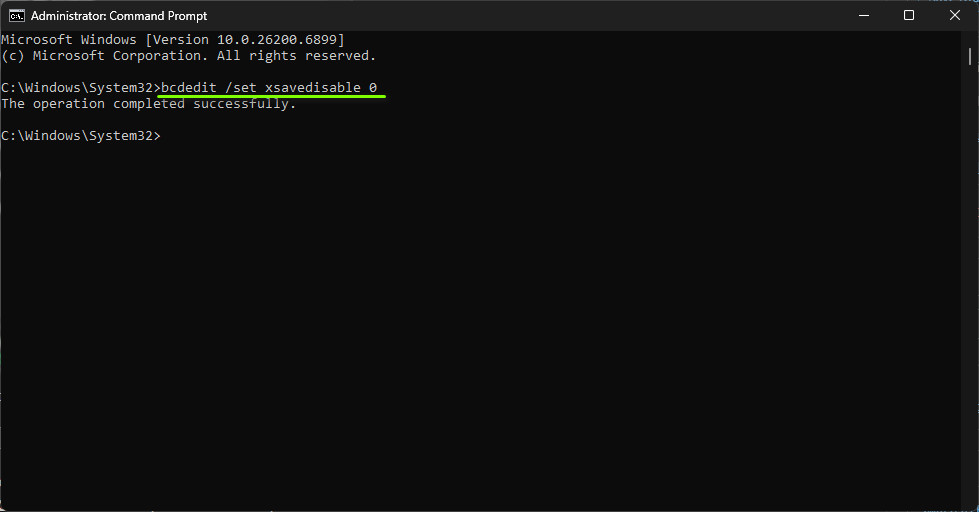 قبل تغيير إعدادات BIOS، تأكد أولاً من أن Windows يقوم بتهيئة AVX بشكل صحيح. ينطبق هذا فقط إذا كان معالجك يدعم AVX. يُمكن الأمر أدناه حفظ حالة وحدة المعالجة المركزية (CPU) الموسعة التي يعتمد عليها AVX، مما قد يحل الحالات التي لا يقوم فيها Windows بتهيئة AVX كما هو متوقع.