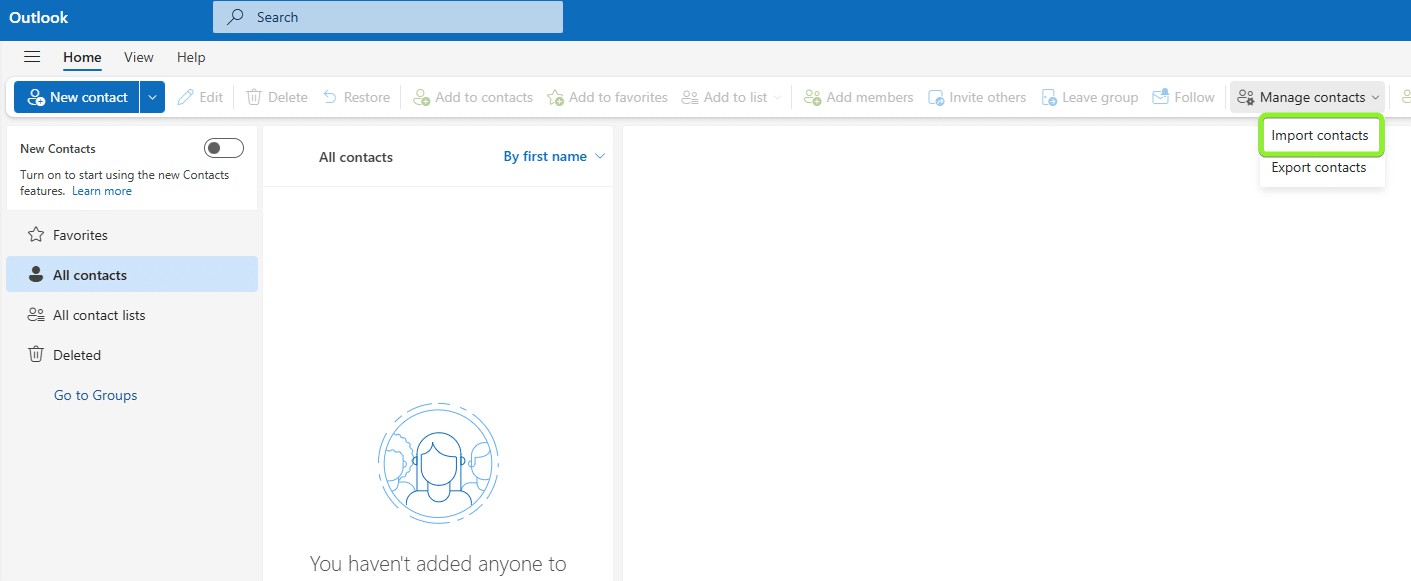 - بعد اكتمال الاستيراد، ستظهر جهات اتصالك ضمن قسم الأشخاص في Outlook على الويب وستكون متاحة في دفتر العناوين الخاص بك.