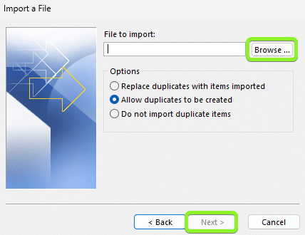 - حدد كيف تريد أن يتعامل Outlook مع التكرارات، ثم انقر فوق التالي. إذا لم تكن متأكدًا، فإن اختيار السماح بإنشاء تكرارات هو الخيار الأكثر أمانًا ويمكنك تنظيف التكرارات لاحقًا.