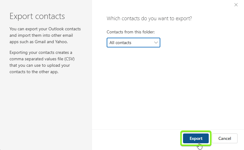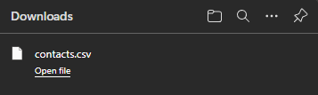 - سيتم تنزيل ملف CSV الخاص بك إلى جهاز الكمبيوتر. يمكنك استخدام هذا الملف لـ استيراد جهات الاتصال الخاصة بك إلى Outlook أو خدمة بريد إلكتروني أخرى.