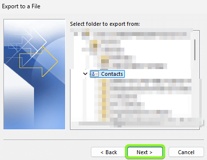 - سترى الآن جميع مجلدات جهات الاتصال المتاحة. حدد مجلد جهات الاتصال الذي تريد تصديره وانقر فوق التالي.