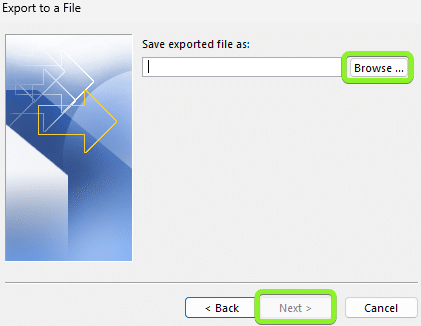 - اختر مكان حفظ الملف المُصدَّر بالنقر فوق استعراض، وسمِّ الملف بوضوح حتى تتمكن من التعرف عليه لاحقًا.