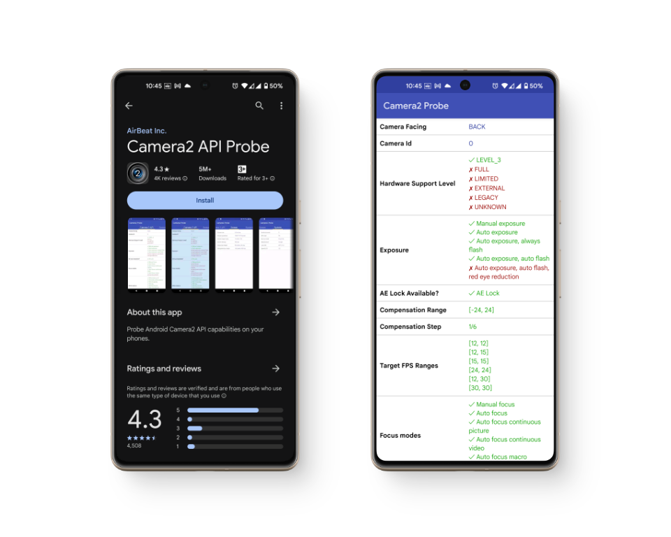 خيار آخر هو تنزيل تطبيق Camera2 API Probe من Google Play Store. يتيح لك هذا التطبيق التحقق يدويًا من توافق هاتفك مع GCam. ضمن قسم ‘مستوى دعم الأجهزة‘: