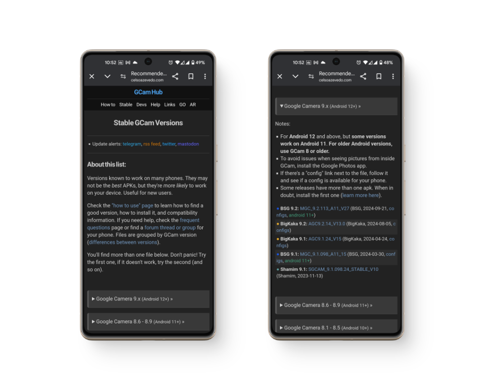 يمتلك Celso Azevedo، أو GCam Hub، صفحة مخصصة للإصدارات المستقرة من هذه التعديلات من مطورين متعددين – BSG، Arnova8G2، Shamim، BigKaka، و MWP. تتراوح هذه الإصدارات من GCam 3.0 إلى أحدث إصدار. يأتي كل تكرار بمجموعة ميزات مختلفة، وقد يعمل أحدها أحيانًا بشكل أفضل من الآخر.