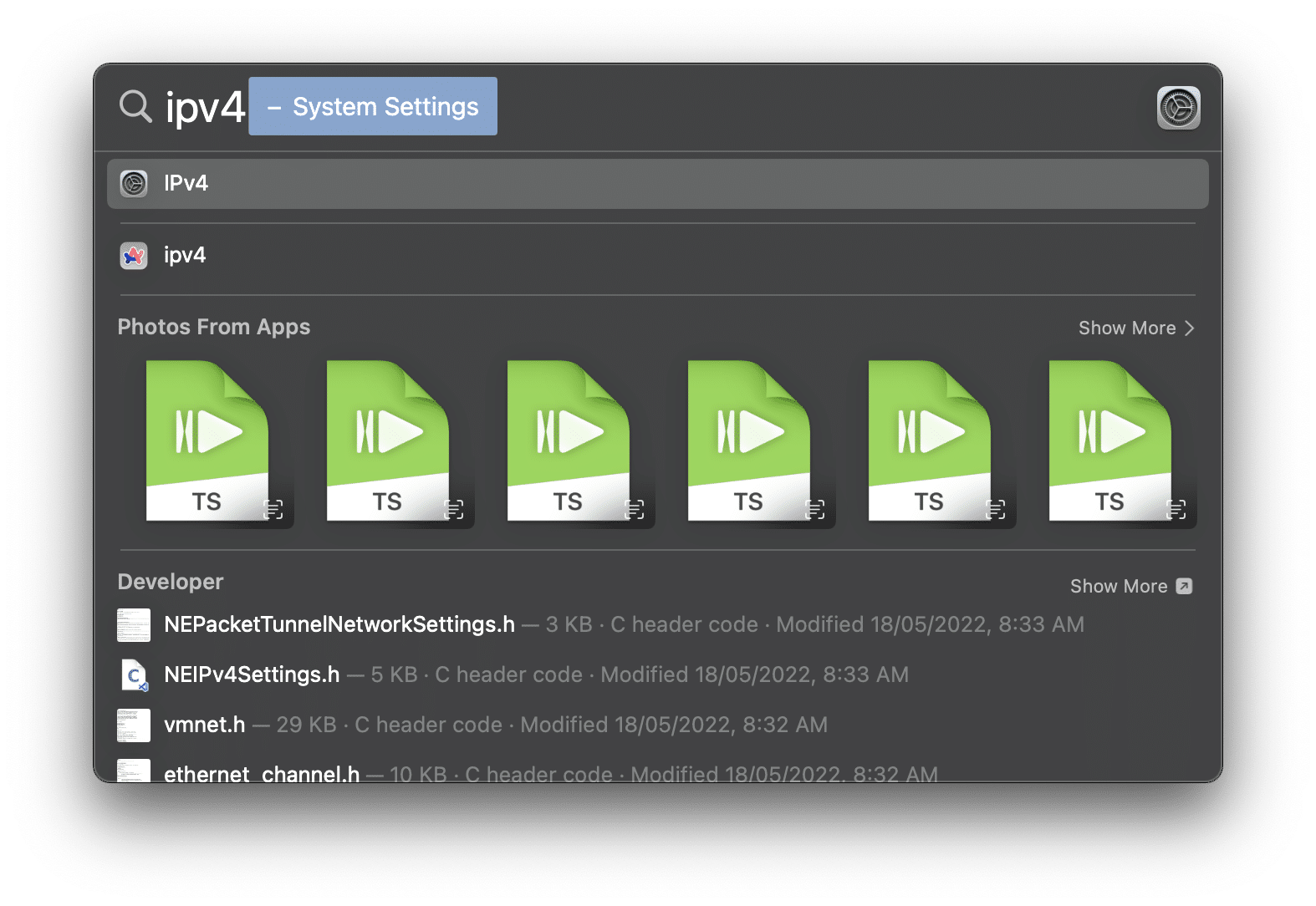 - اضغط على **Command + Spacebar** لفتح بحث Spotlight واكتب **IPv4**. اضغط على **Enter**.