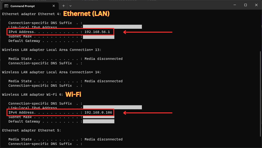 تأكد من التحقق من عنوان IP الخاص بمحول الشبكة المستخدم حاليًا. على سبيل المثال، في الصورة أعلاه يوجد عنوانا IP؛ الأول لـ Ethernet، والثاني لـ Wi-Fi. معظم أجهزة الكمبيوتر سيكون لديها واحد فقط في كل مرة.