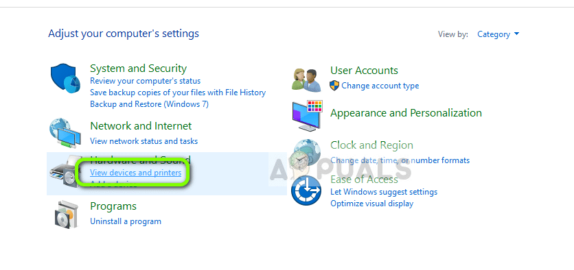 2. بمجرد دخولك إلى لوحة التحكم، اختر الخيار عرض الأجهزة والطابعات الموجود أسفل الأجهزة والصوت.
